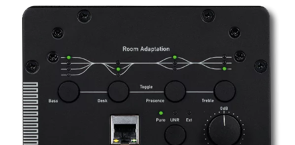 À l’arrière des enceintes de la Série A, vous trouverez quatre bandes d’égalisation dédiées à l’adaptation à l’espace d’écoute : Bass, Desk, Presence et Treble. Chaque bande est réglable par paliers ; vous bénéficiez ainsi d’une centaine d’options pour vous aider à compenser les problèmes acoustiques typiques survenant lors du placement des enceintes.
