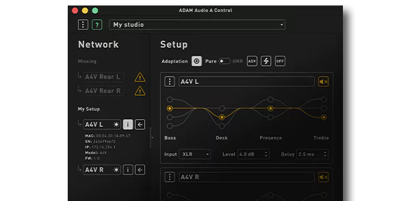 Les fonctionnalités du DSP de toutes les enceintes de monitoring de la Série A peuvent être contrôlées à distance et en temps réel via Ethernet à l’aide du logiciel A Control. Le logiciel pour MacOS et Windows peut être téléchargé gratuitement une fois les enceintes de la Série A enregistrées sur l’espace utilisateur MyADAM .