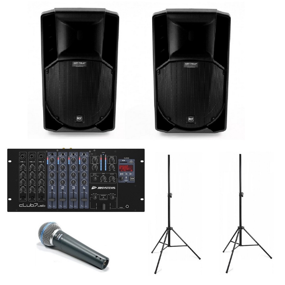 2 enceintes amplifiées, 700W chacune, 1 table de mixage JB Systems club7 USB, 1 micro