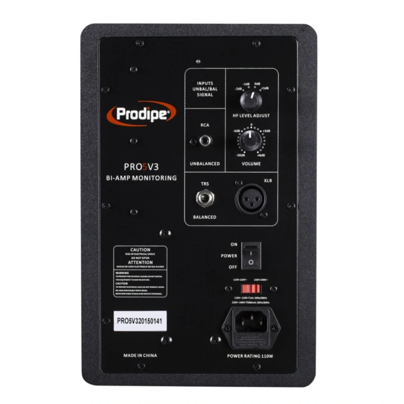 Moniteurs audio professionnels pour le studio, 50 + 25 Watts RMS, bi-amplifiés. Couplées avec le caisson de basse PRO 10S V3, les Prodipe Pro5 V3 vous offrent l’écoute Studio à moindre coût. La gamme des enceintes Pro5, Pro8 et Pro10S évolue et vous est présentée dans sa nouvelle version V3 : nouveau woofer avec membrane en fibre de verre, nouveau tweeter à dôme en néodymiun et nouvelle électronique pour encore plus de rapidité, de dynamisme et de présence. Les woofers sont désormais équipés de membrane en fibre de verre. En équipant toutes nos enceintes avec des membranes en fibre de verre, nous avons encore gagné en rapidité et en dynamisme, la réponse en fréquence est encore plus droite et le résultat à l’écoute est d’un naturel saisissant. Les aimants des transducteurs sont blindés par des caches en acier anodisés. Le filtrage actif a entièrement été revu afin d’avoir des fréquences de séparation sans accident, ni bosse, le renversement de la phase, ainsi que le coupe-bas du caisson sont ajustables. L’habillage du caisson est fait d’un bois à forte densité afin de garantir une qualité sonore constante et sans vibration indésirable. Contrairement à de nombreuses autres références, nous avons placé l’évent de type « Bass reflex » sur l’avant afin d’améliorer la décompression sur les basses, ce qui permet un positionnement de l’enceinte bien plus facile. La connectique est complète pour une utilisation universelle :XLR / Jack TRS 6.35 pour une connexion symétrique, et Cinch (RCA) pour une connexion asymétrique. Une ligne compacte et élégante, des finitions soignées.