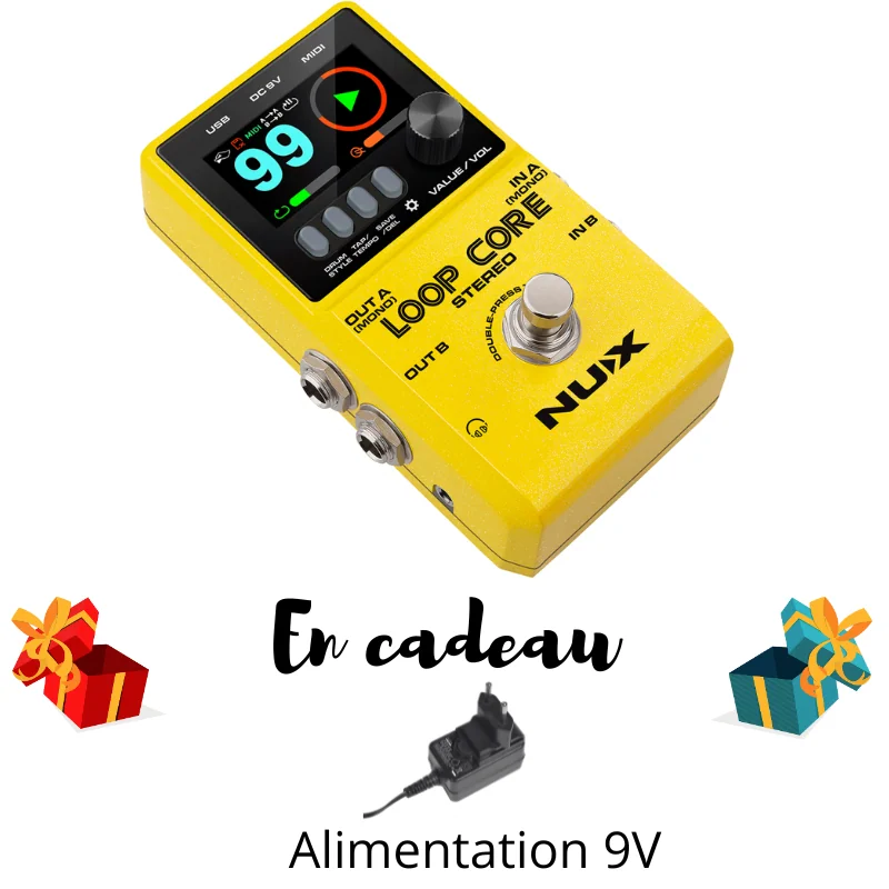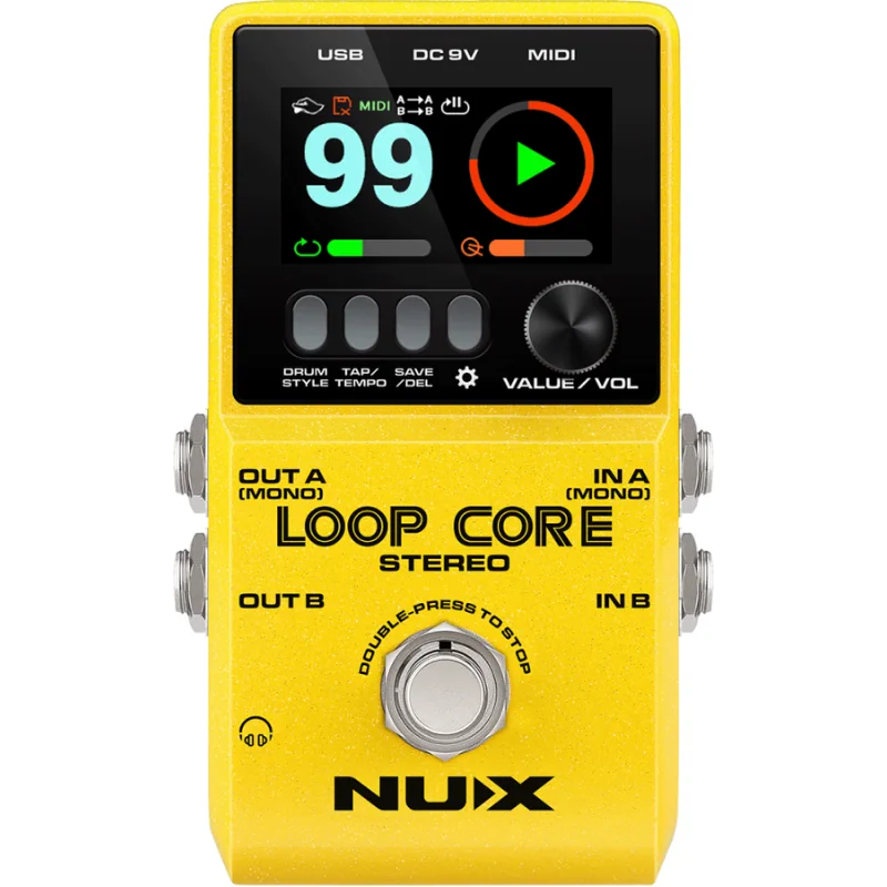 Il est facile de créer des boucles et de s’entraîner avec le NUX Loop Core Stereo. Allumez la pédale Loop Core Stereo, tournez le bouton VALUE pour sélectionner une mémoire vide de 01 à 99, puis appuyez sur le commutateur au pied pour enregistrer/jouer/dub vos boucles. Vous pouvez également maintenir la pédale enfoncée pour UNDO/REDO/CLEAR.